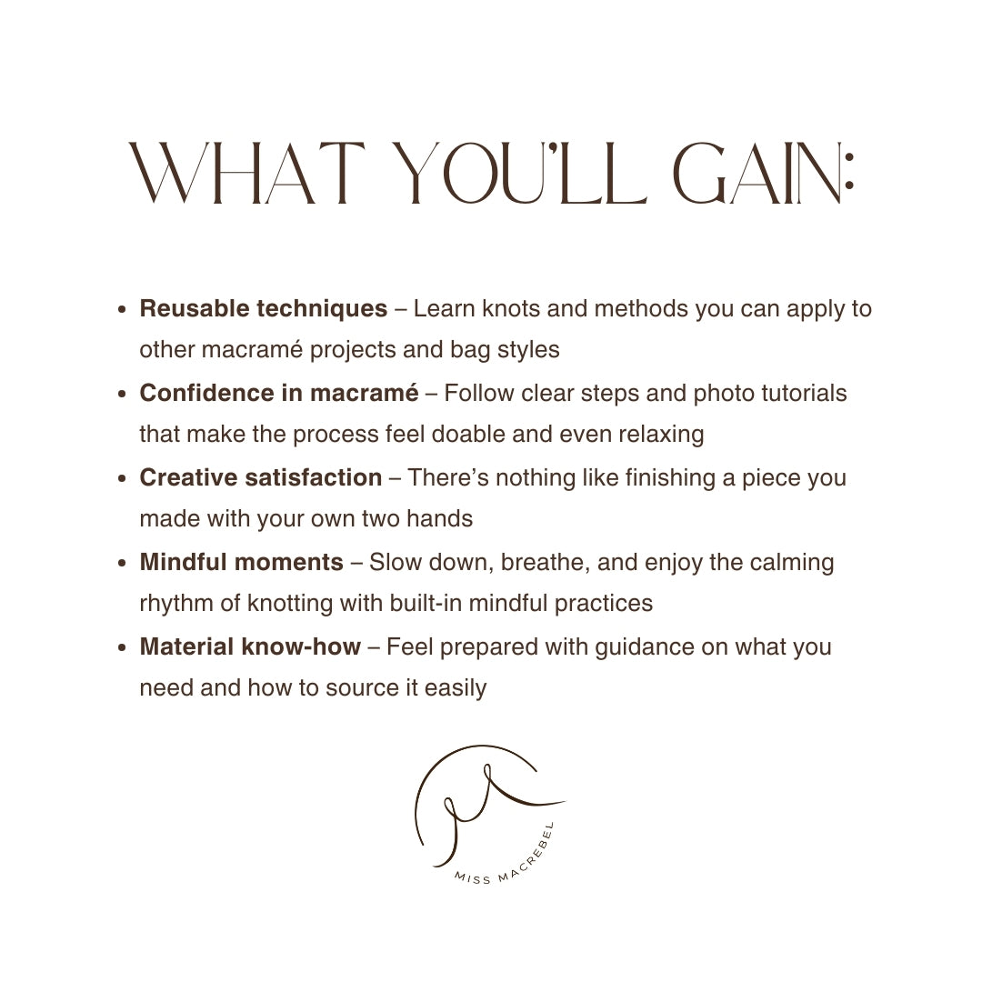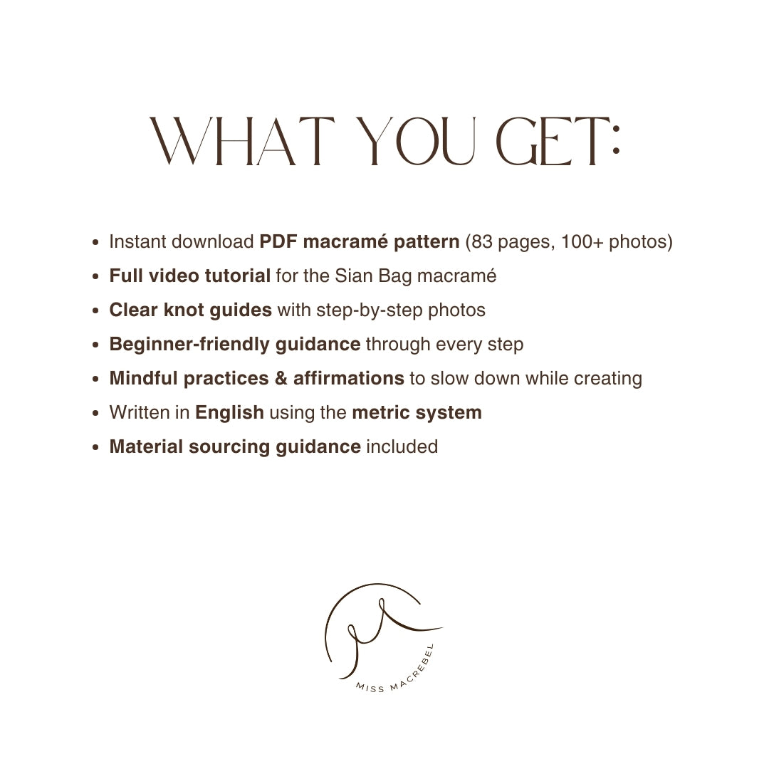 This digital pattern guide includes everything you need to create your own Sian Bag at home. Whether you’re an experienced maker or new to macramé, this project invites you to slow down, breathe, and enjoy the mindful rhythm of every knot.